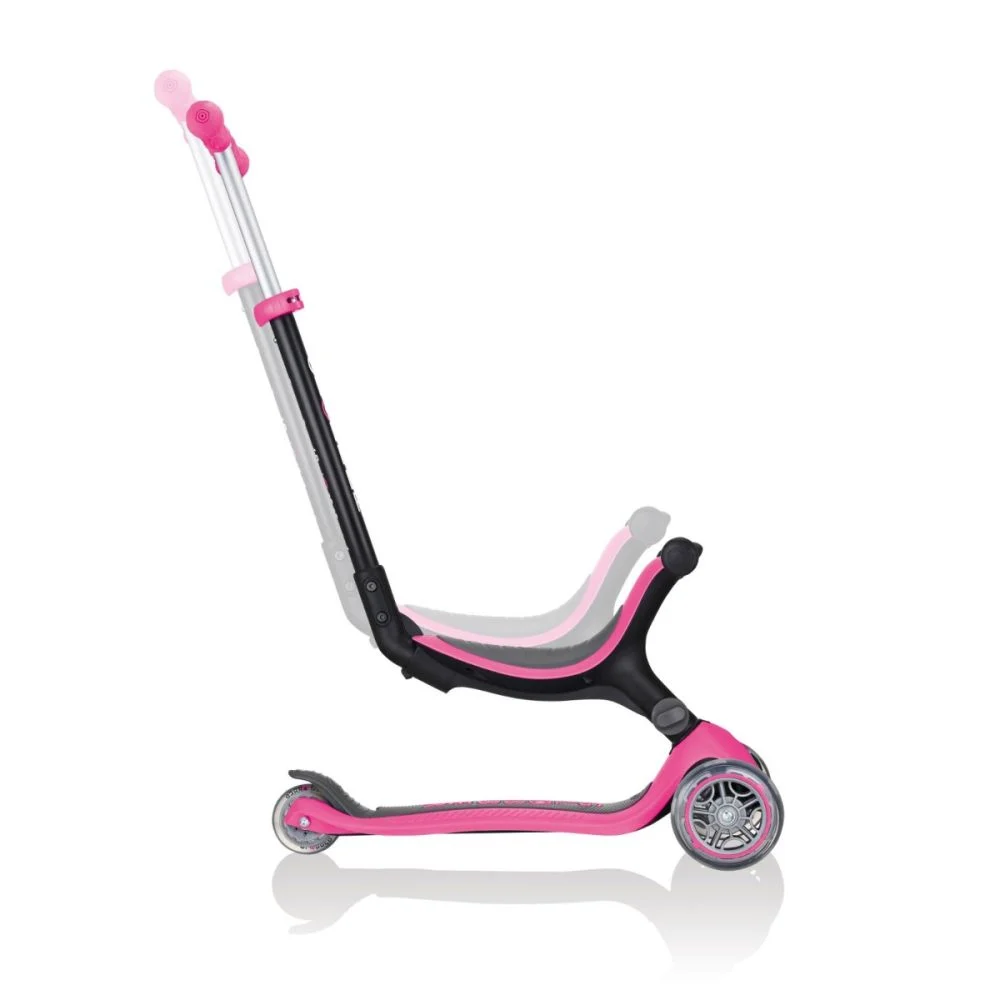 Trotineta Globber GO UP 3 in 1, pliabila, ghidon si scaun ajustabile pe inaltime, rulmenti ABEC 5, culoare roz are sistem patentat de pliere, util pentru transport si depozitare mai usoara. Designul fara unelte simplifica transformarea intre moduri, iar suportul de picioare este inclus pentru etapa ride-on, cand copilul are nevoie de sprijin suplimentar.