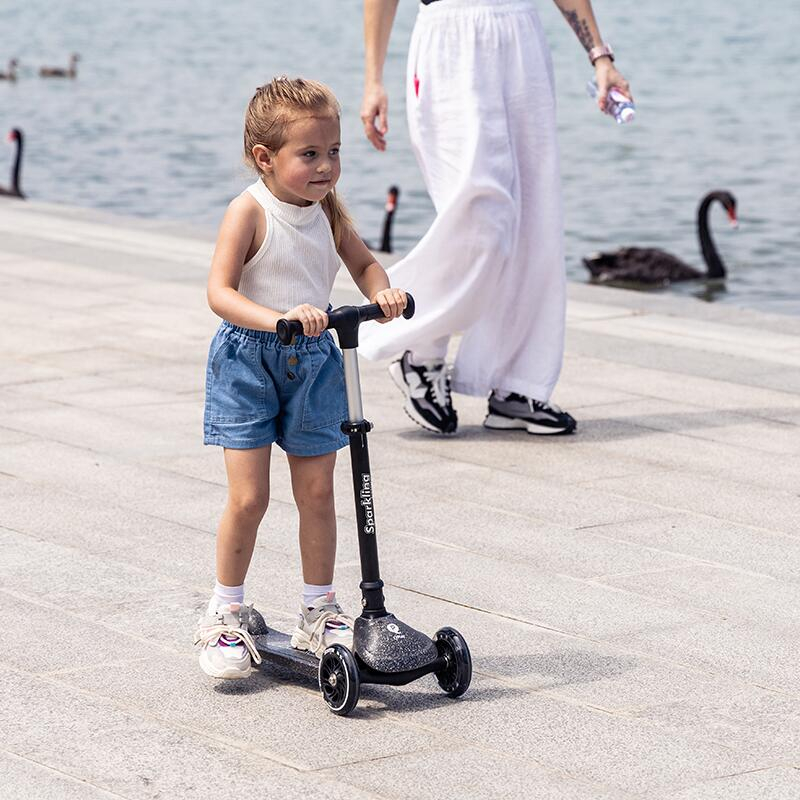 Configuratia cu 3 roti ofera un plus de stabilitate, iar sistemul de directie prin inclinare ajuta copilul sa exerseze echilibrul si coordonarea in mod natural. Frana de picior montata pe roata din spate contribuie la oprire simpla si rapida. Trotineta pliabila Qplay Sparkling, Negru este potrivita pentru utilizatorii mici care au nevoie de un model usor de controlat si confortabil in utilizare.