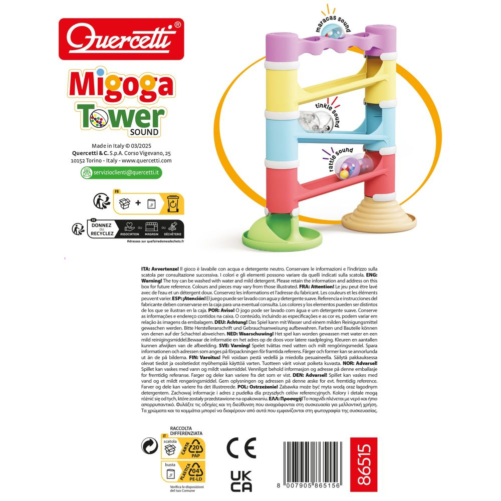Turn Migoga ECO cu sunete Quercetti este un traseu de bile pentru cei mici, creat pentru joaca senzoriala simpla si captivanta. Copilul pune bilele pe traseu, le impinge usor cu mana si urmareste cum coboara prin turn, insotite de sunete placute, intr-un ritm care invita la repetare.